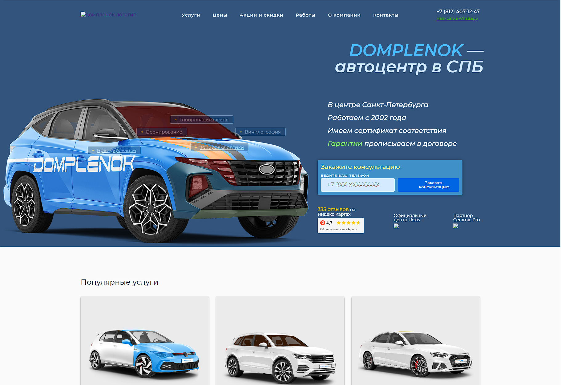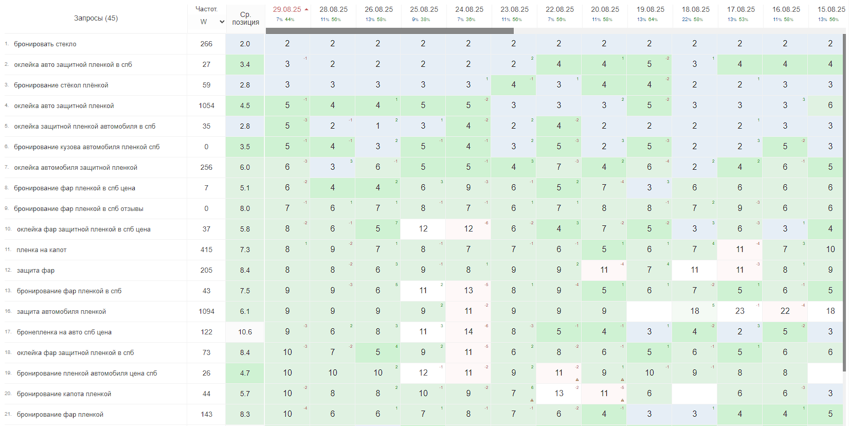Сайт автосервиса ДомПленок — хороший пример последовательной работы. Не сразу все у меня получалось. Но количество попыток перешло в качественный трафик для сайта. Если вы ищите подрядчика для продвижения сайта автосервиса — вот он я, пишите.