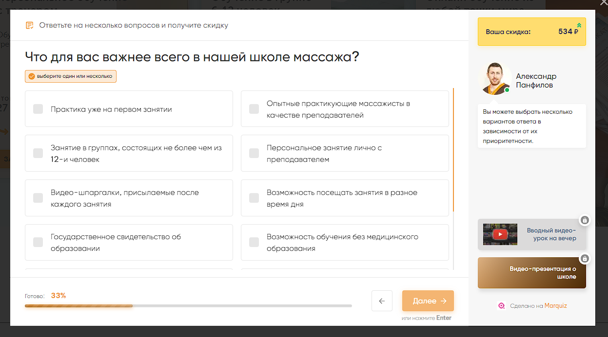 Сам опросник создан на пионере среди сервисов по созданию квизов, marquiz. Сервис развивается. Внутри квиза есть множество необходимых для подачи информации элементов: скидка, подарки, подсказки и комментарии. Проще (дешевле, быстрее, лучше результат) воспользоваться сервисом, чем разрабатывать самому (а я делал такое).