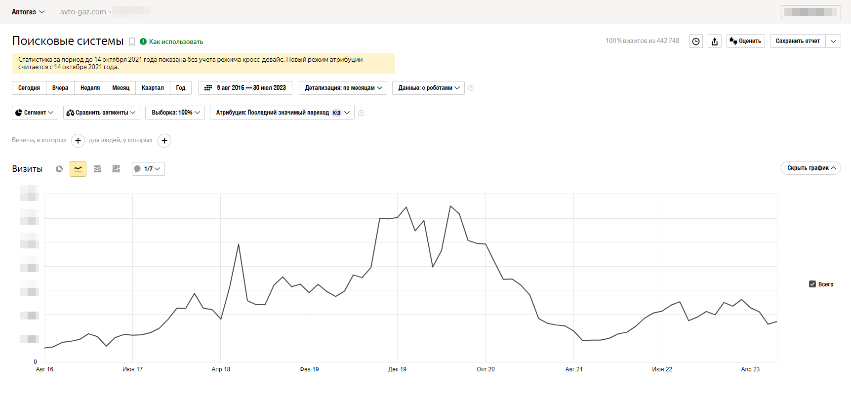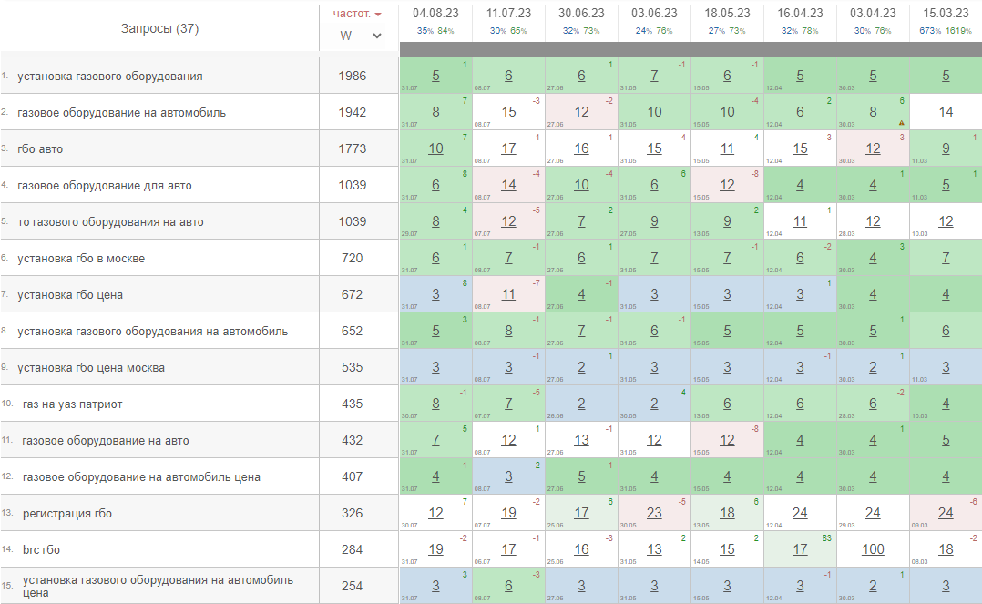 Около 2-3 лет я не работал над продвижением сайта. Но позиции так и остались высокими. Жаль что из-за цен на газ снизился интерес к ГБО. Поэтому не получится показать красивый график, покажу тот что есть.
