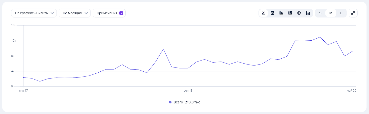 Создав под каждую марку, модель (а иногда и двигатель) посадочные страницы я резко увеличил количество запросов, на который отвечает сайт. И трафик начал расти достаточно быстро. За 2 года посещаемость сайта выросла до 12000 уникальных посетителей в месяц. Была ~3 тысячи.